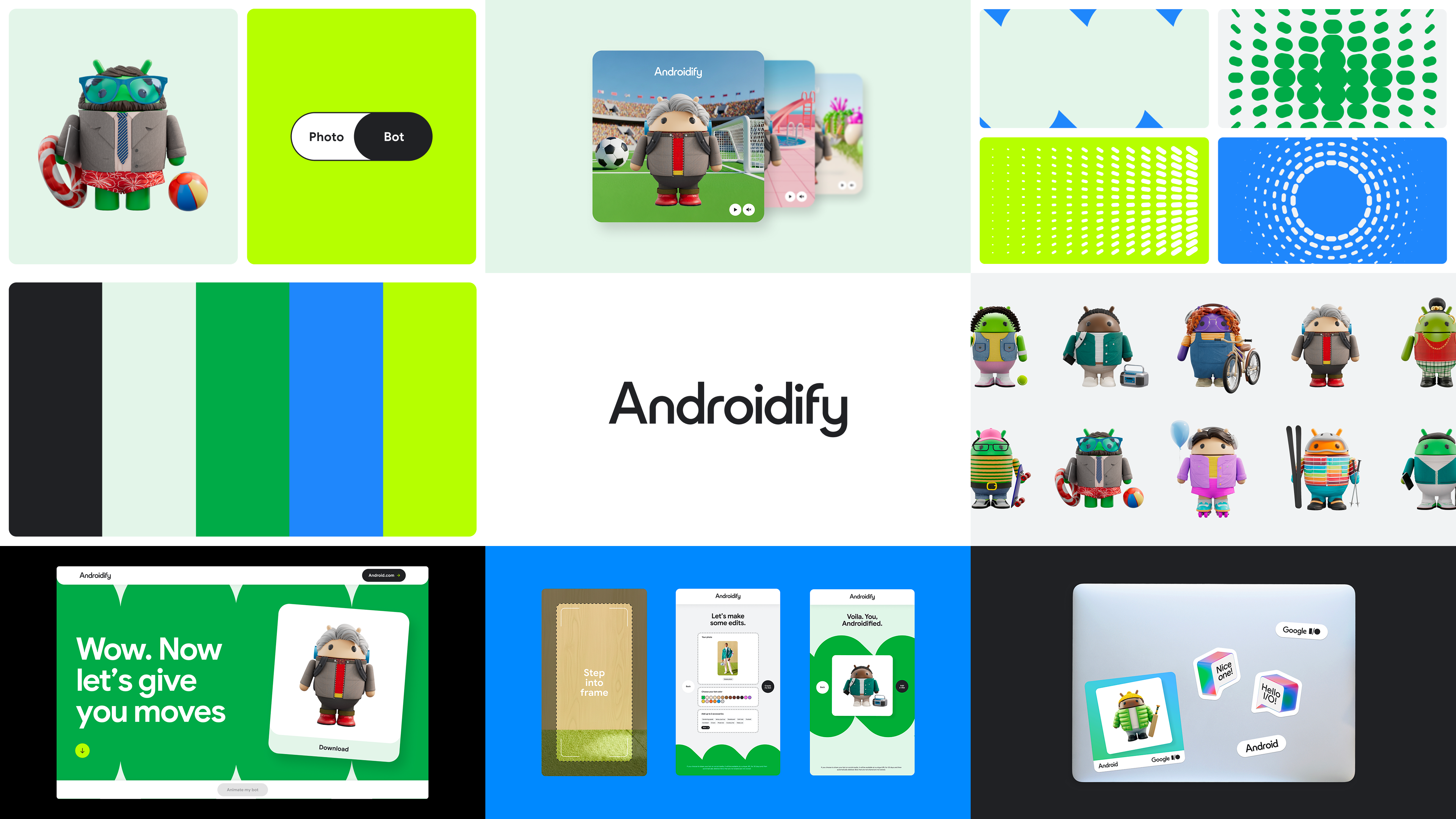 My contribution focused on shaping the identity behind the experience — defining the visual elements that bring Androidify to life, including the logo, color palette, shape language, and photography direction. These components helped build a brand world that feels flexible, expressive, and unmistakably Android.